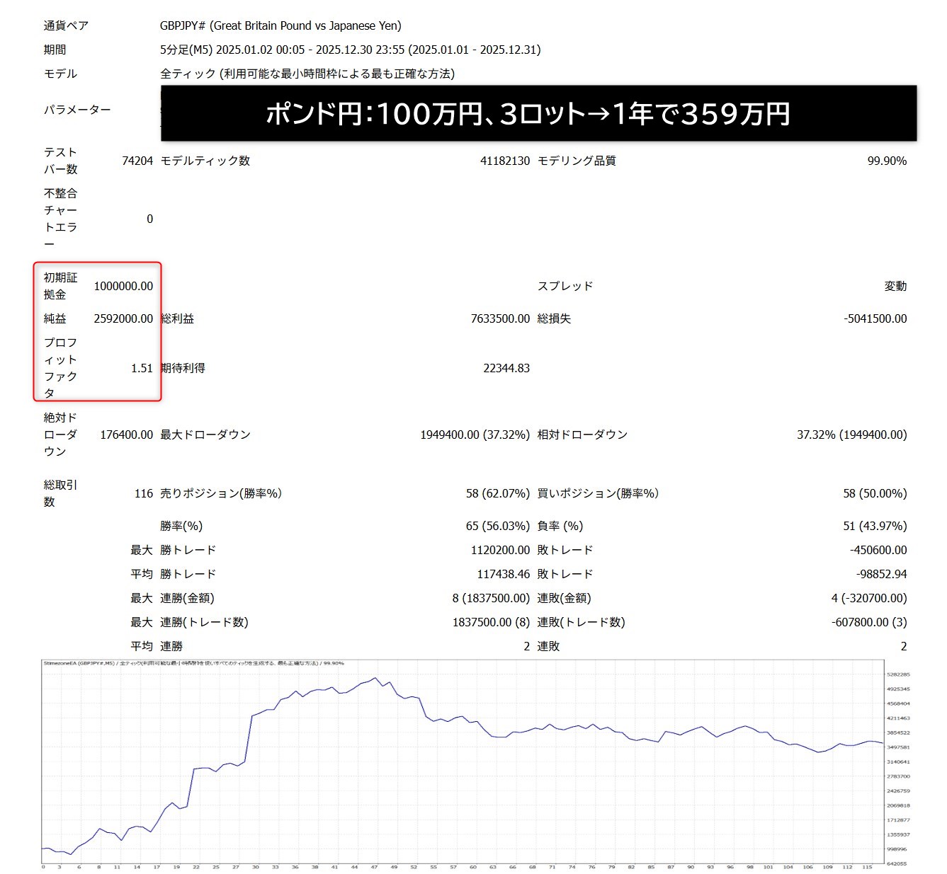 設定されている「100万円に対して3ロット(30万通貨)」は、一般的な資金管理の常識からするとかなりハイリスクな設定です。