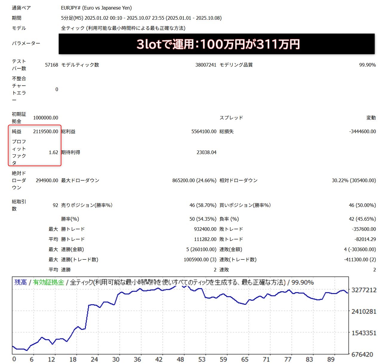 かなりアグレッシブな設定ですが、3通貨ペア合計ですと初期資金が合計300万円でそれが1000万円に増えていますので投資としては大成功な部類でしょう。