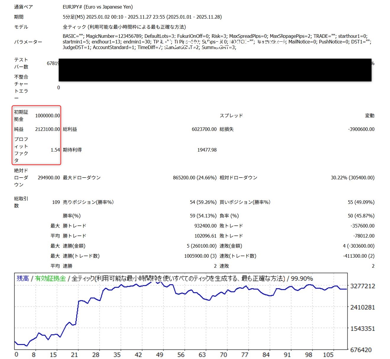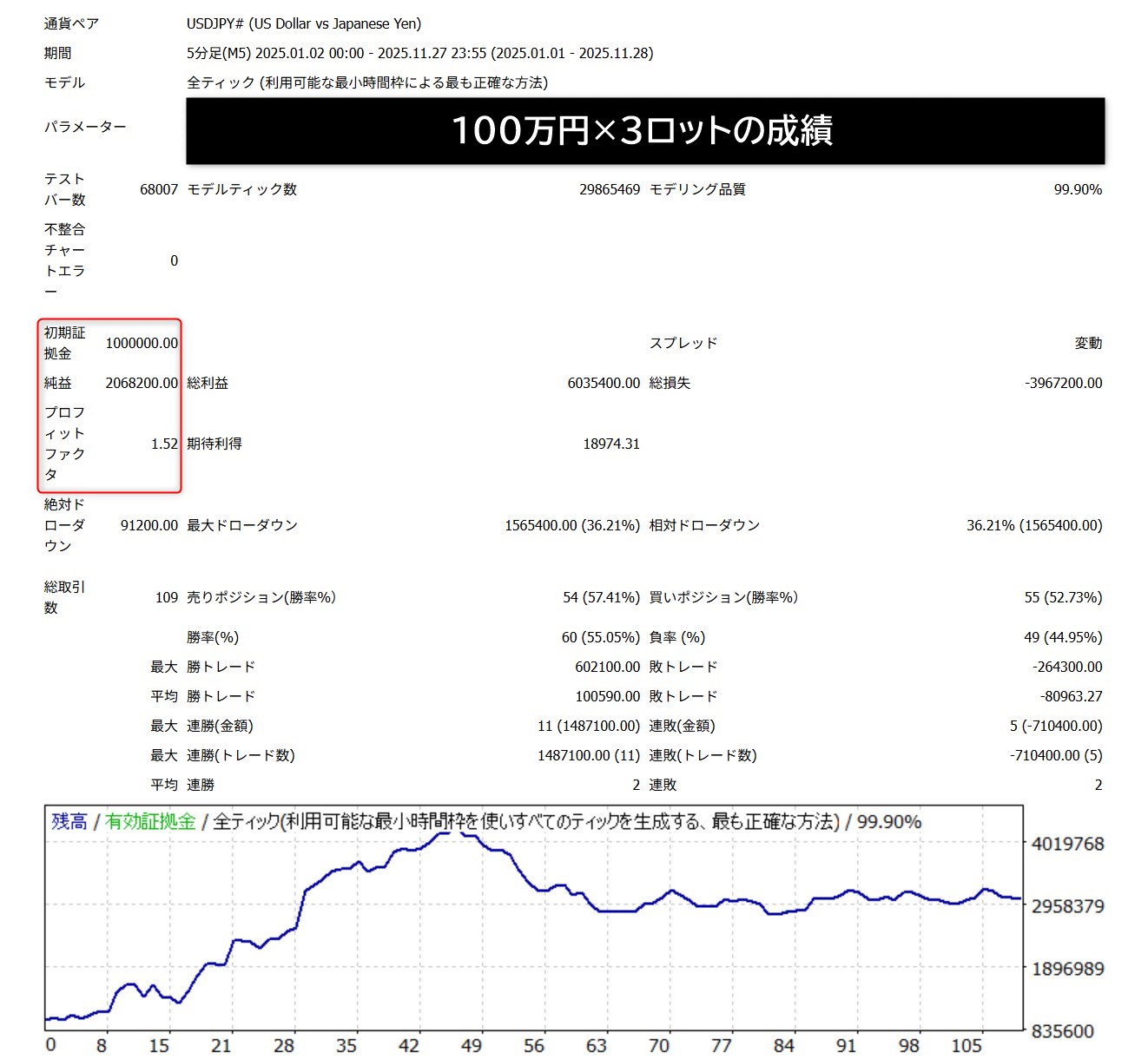 5タイムゾーンEAを今年の1月から11月で運用するとプラスで推移しています(初期資金100万円×3通貨ペアが950万円)。