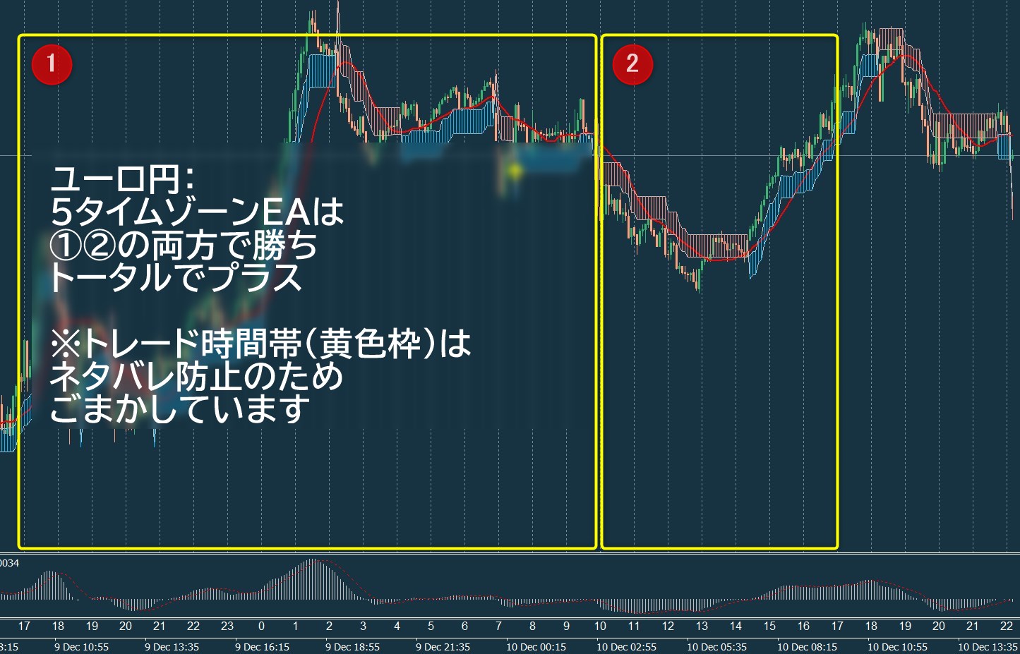 本当の5タイムゾーンEAのトレードイメージとしてチャートで見ると以下のように勝てています。