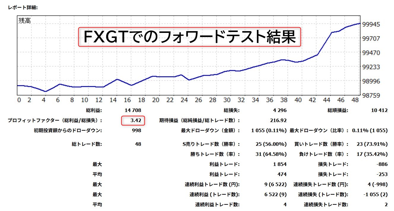 バックテスト結果はあくまでも過去相場におけるテスト結果なので、今後そのトレード手法が通用しなく可能性があり勝つことが難しくなる可能性があります。また、FX業者によってレバレッジや最大ロット数、その他の細かい違いでパフォーマンスの違いが生じます。ただし、いくらバックテストとはいえ、完全自動でここまでの成績を上げれるEAもあまりありません。