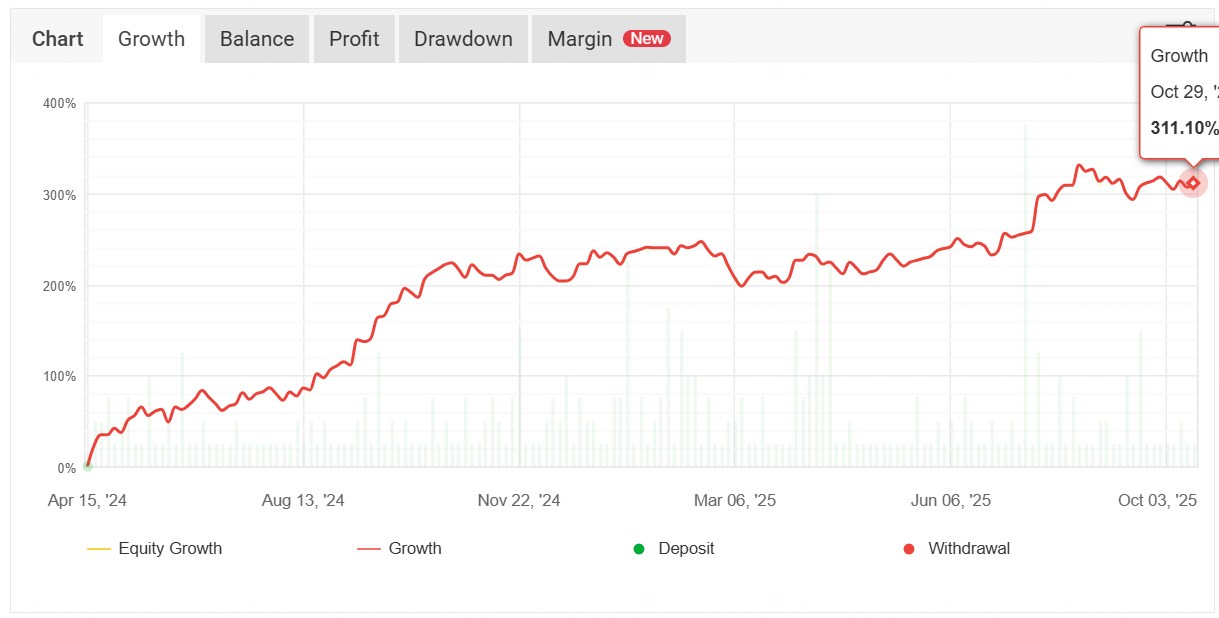 このEAは一貫して高パフォーマンスを維持しています。週ごとのボラティリティはやや大きいものの、回復の早さ・勝率・成長率のバランスが極めて良好です。直近30週に限ると、安定性がさらに高まっています。1通貨ペア1ロット運用で、リスクを抑えつつ十分な利益効率を実現できる設計です。