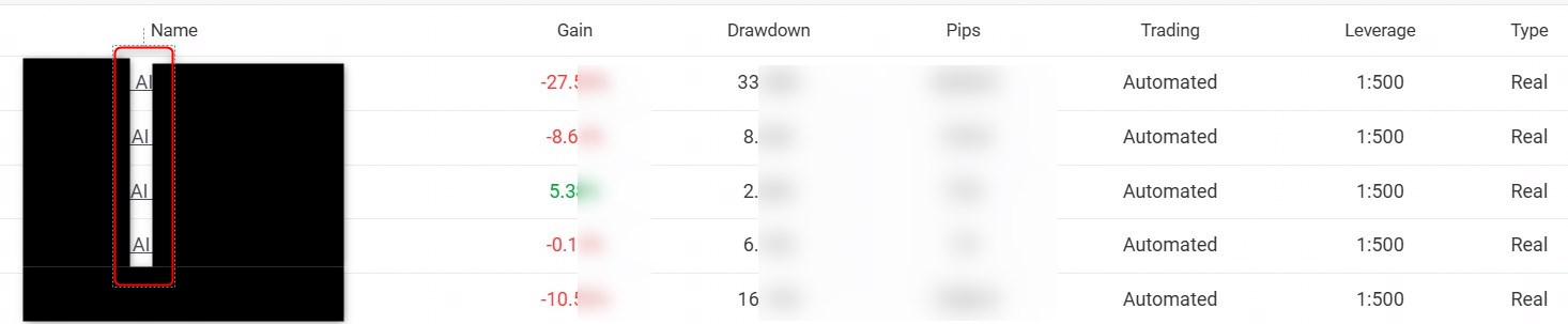 表立って批判をするつもりは無いので黒塗りが多いのですが、SNSで比較的有名なFX系インフルエンサーが作成したAI搭載のEAのトレード成績は以下です。