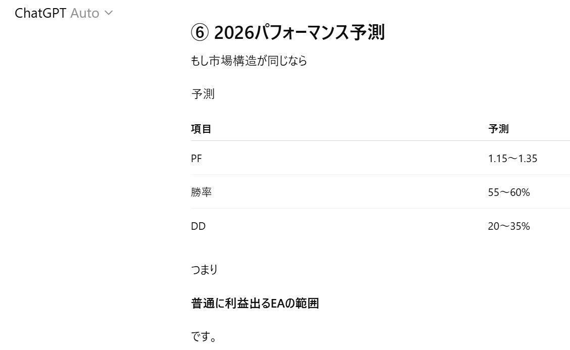 当サイトの無料特典EAであるAimRageとついて、これまでのフォワードテスト結果と2026年の見通しをAI(ChatGPT)に評価してもらいましたので共有します。