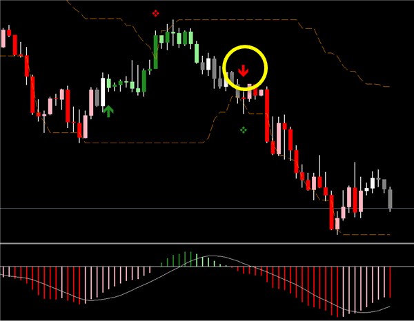 ちょうどそのトレンド転換時に、未来予知FXの方でもトレンド転換シグナルが出現したので、大きく利益を伸ばせるエントリーの可能性が高まります。