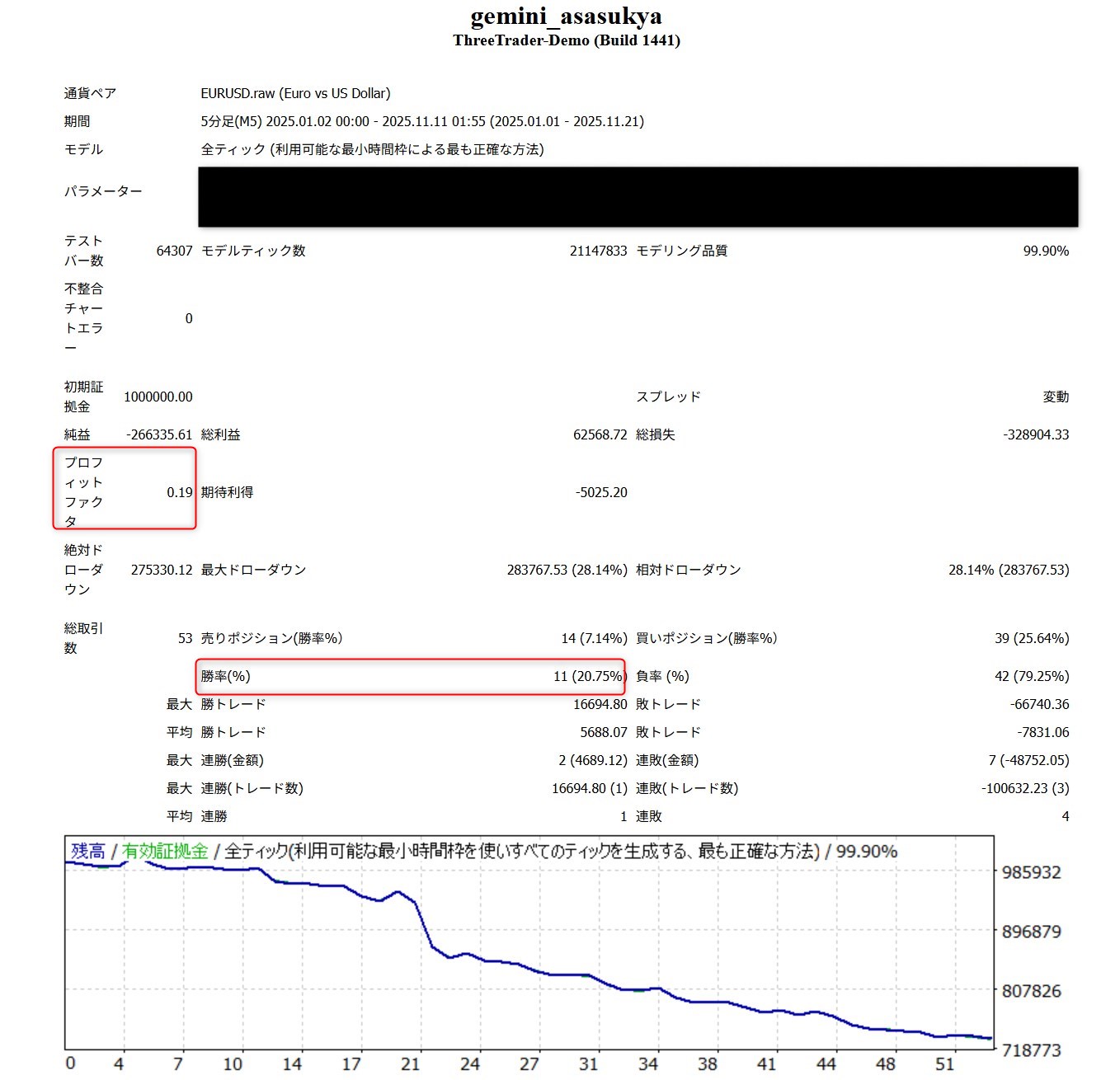 いくらすごいAIが開発したEAと言っても、いきなり使うのは危険すぎますのでバックテストを実施してみました。直近の値動きに最適化しているかもしれませんので、まずはGeminiから推奨された2025年1月以降のドル円5分足でバックテストをしました。その結果が以下です。