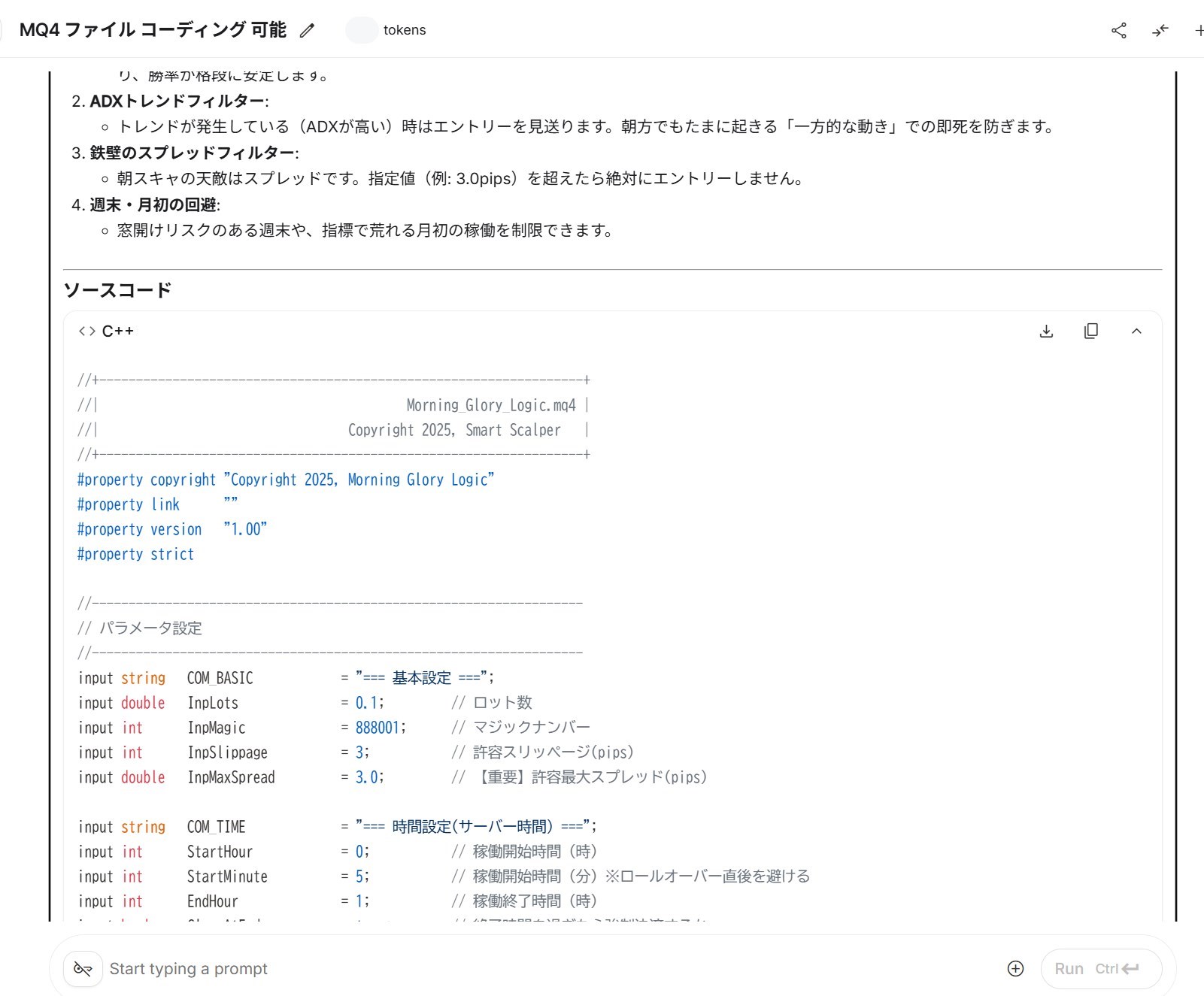 僕は「あなたが考える勝ちやすい朝スキャEAを作ってください」という日本語をGeminiの画面上で入力して実行しました。以下キャプチャのような概要説明とプログラミングが自動で出力されました。