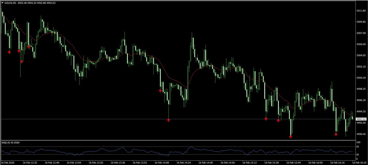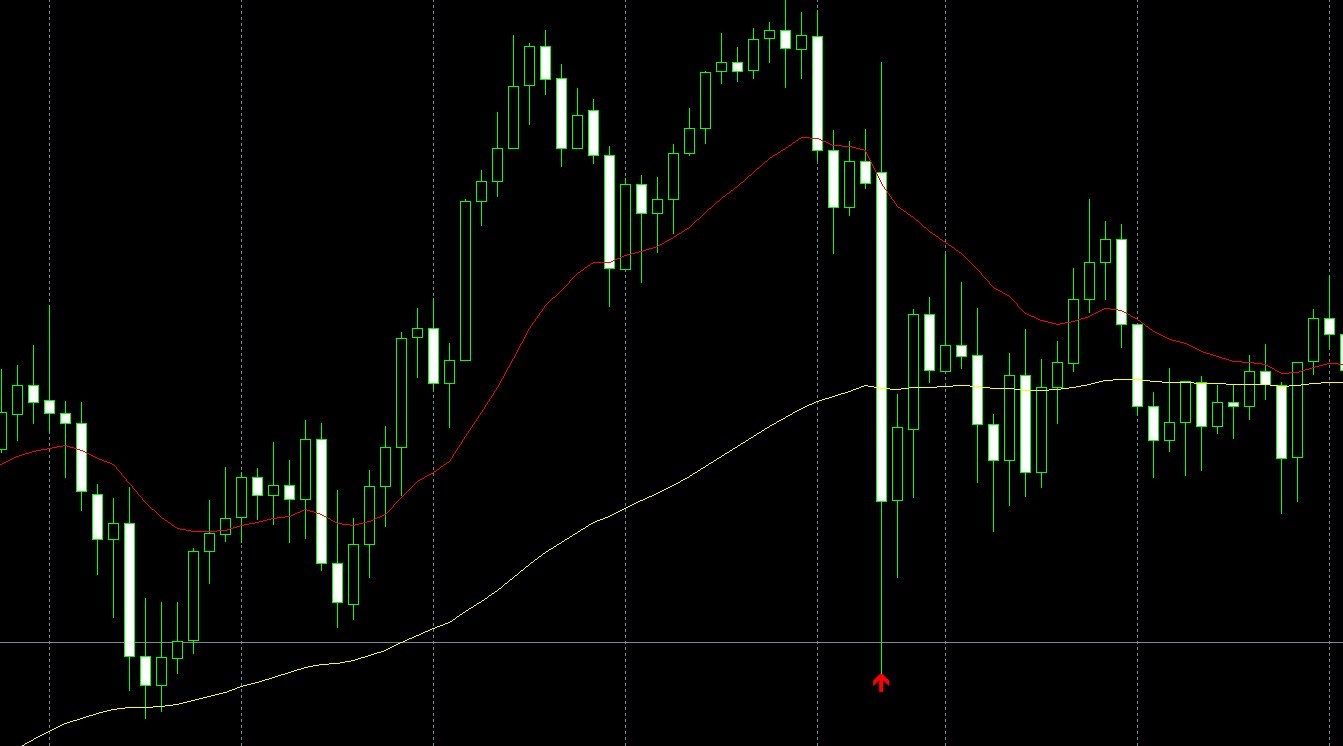 赤い上矢印が出たローソク足が確定する瞬間にロングでエントリーして、次のローソク足もしくはその次のローソク足で利益を狙います。ボラティリティやノイズが大きいゴールドならではの方法ですが、上のチャート画像は1分足チャートです。