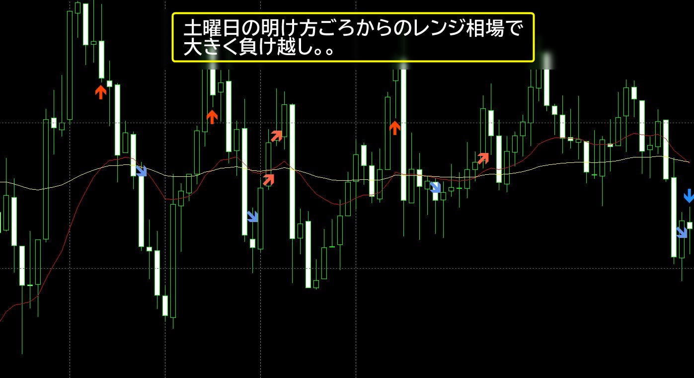 このチャートはビットコインで、時間帯としては土曜日の明け方以降でして大きく負けた場面です。