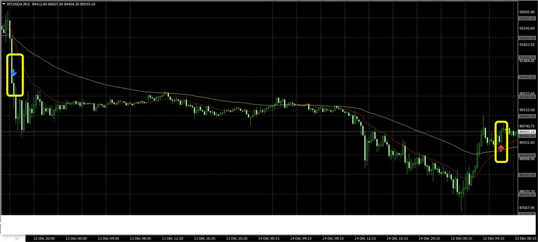 こちらはビットコインです。左端に売りシグナルがあり、もう少しで固定利確幅に届きそうだったのですが、届かずで、チャート右端にある買いシグナルで決済をして終わりました。