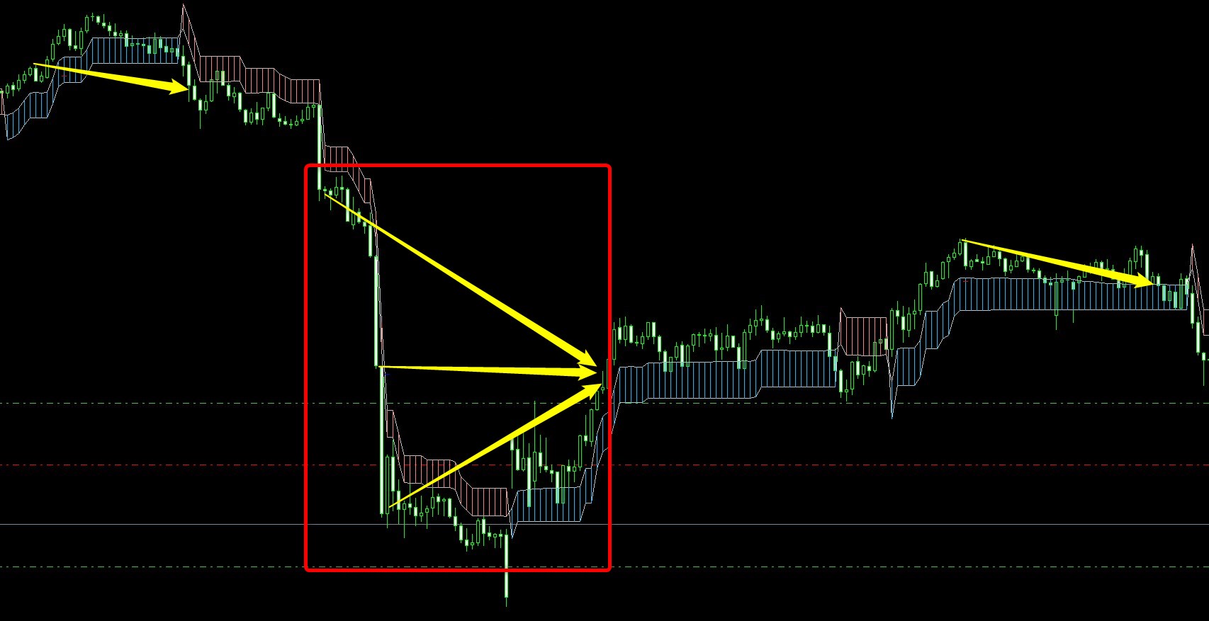 これは直近のチャート画像で黄色い矢印がトレードのエントリーと決済です。赤い枠で囲ったところはトランプ大統領の中国に対する追加関税発言があったタイミングです。