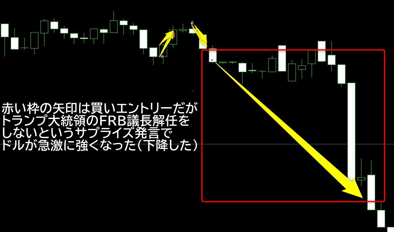 トランプ大統領の政治的なスタンスをここで話をすることは避けますが、上のチャート画像で急激にローソク足が下落しているのはドルの信用が思ったほどでは無くなる可能性が出てきたという事で、ドルが強くなりポンドドルやユーロドルでいうとローソク足が大きく下がりました。