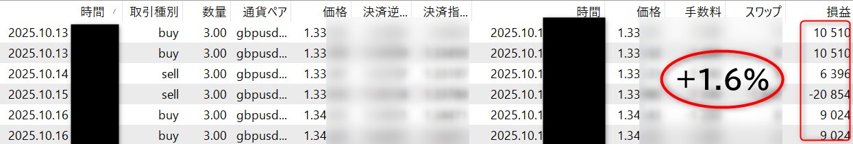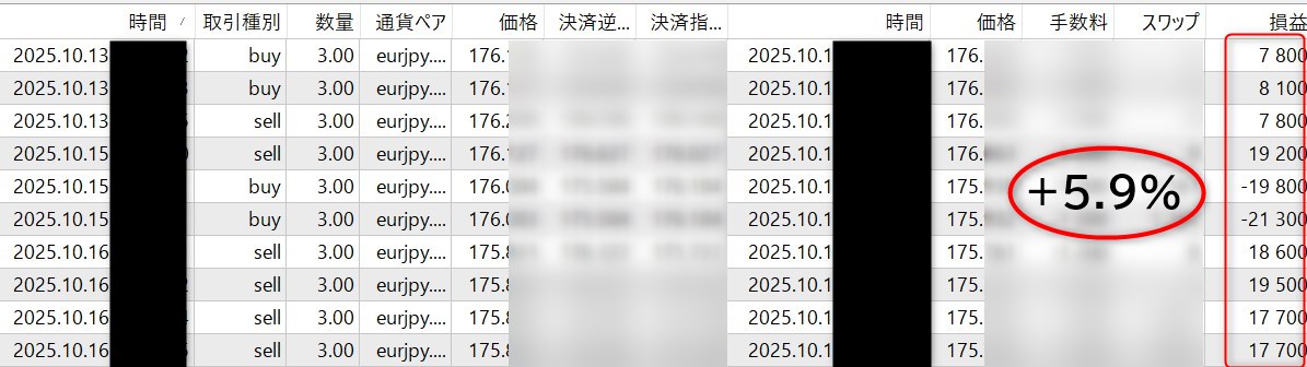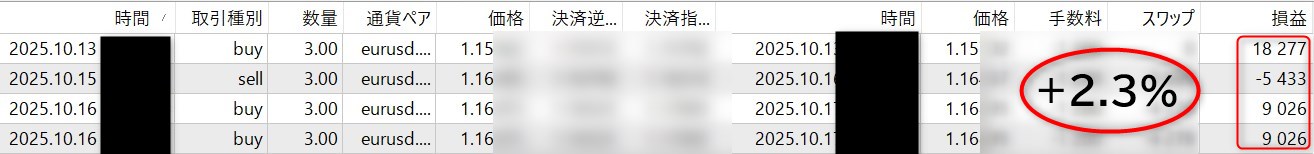 ドローダウン(最大)★★★★☆約-8.4%相当。一時的な下落ありだが、3ロット運用なら心理的にも資金的にも許容範囲。