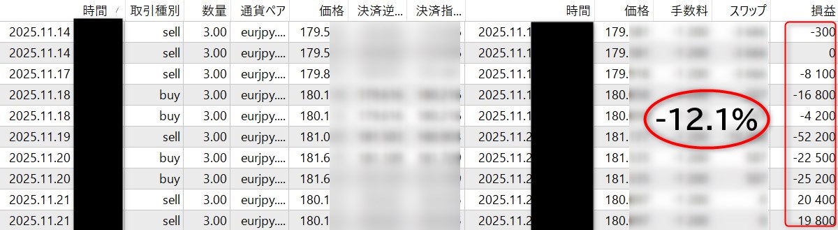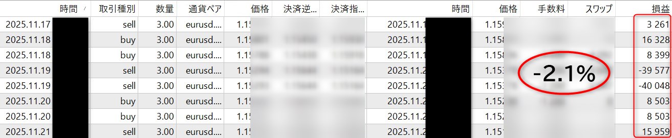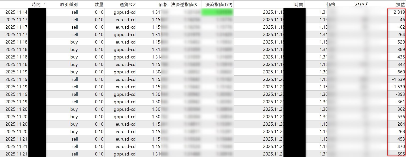 - 対象通貨ペア3つの内、1つでプラス、2つでマイナスでトータルでマイナス
