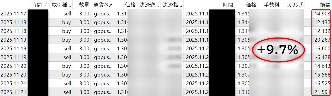 スプレッド(手数料)やスワップ含めた利率で、使用FX業者はスリートレーダーです。