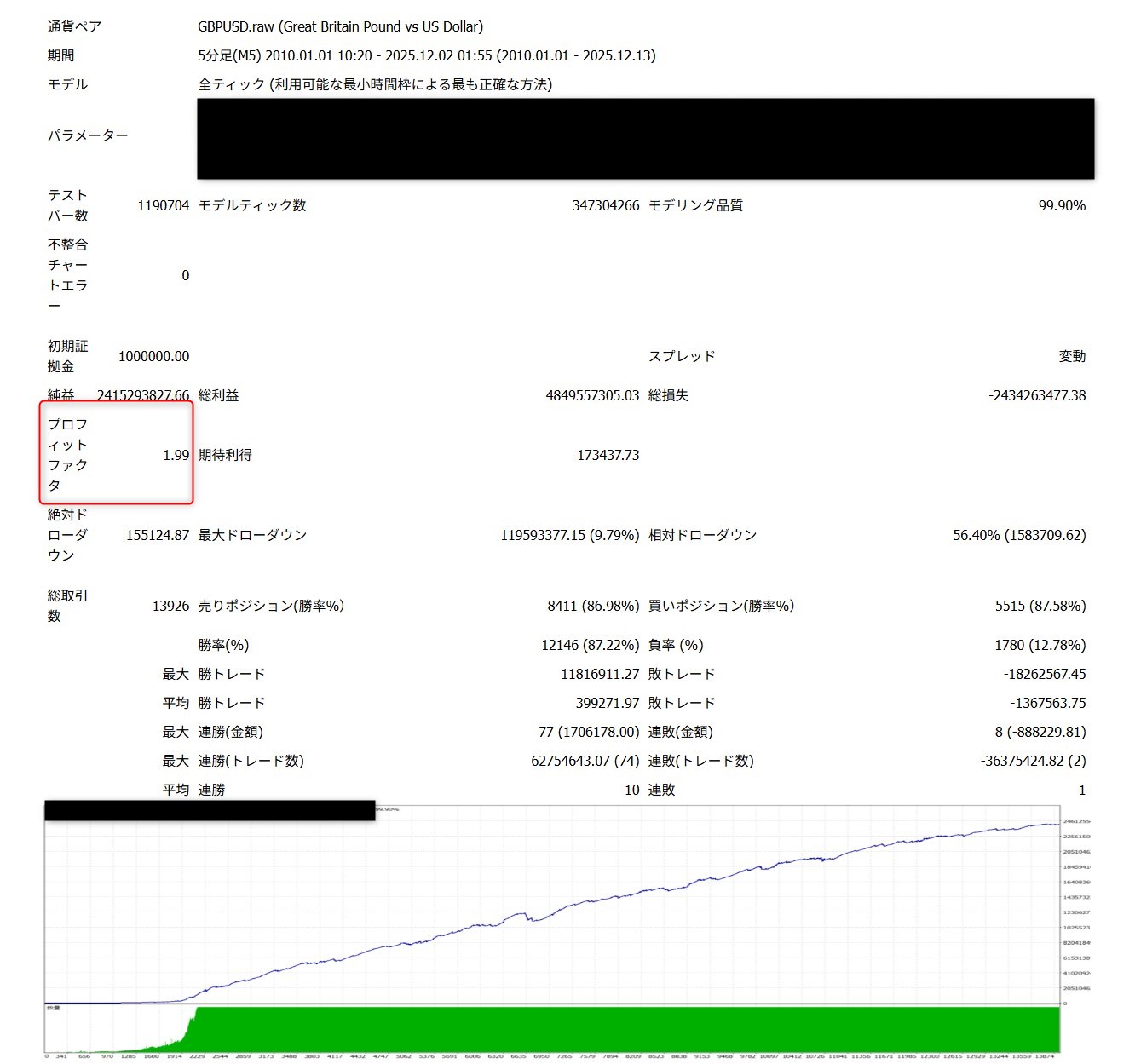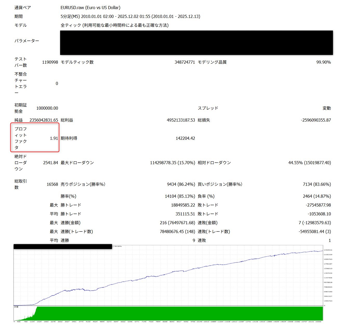 プロフィットファクターが1.9程度と高いのが特徴の1つです。
