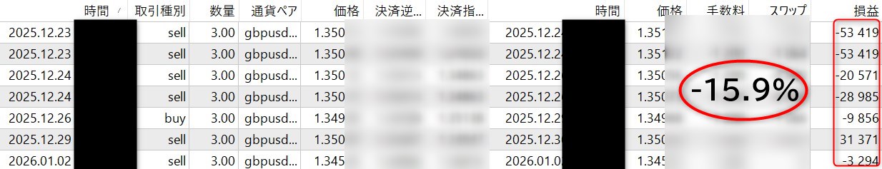 - 対象通貨ペア3つの内、2つでプラス、1つでマイナスだがトータルでマイナス