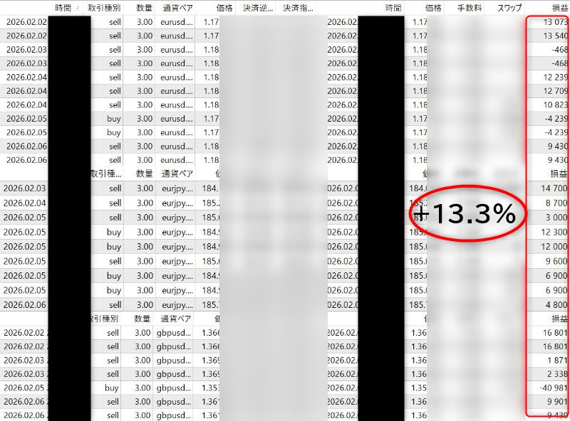 今週の成績(推奨通貨ペア合計:+13.3%)