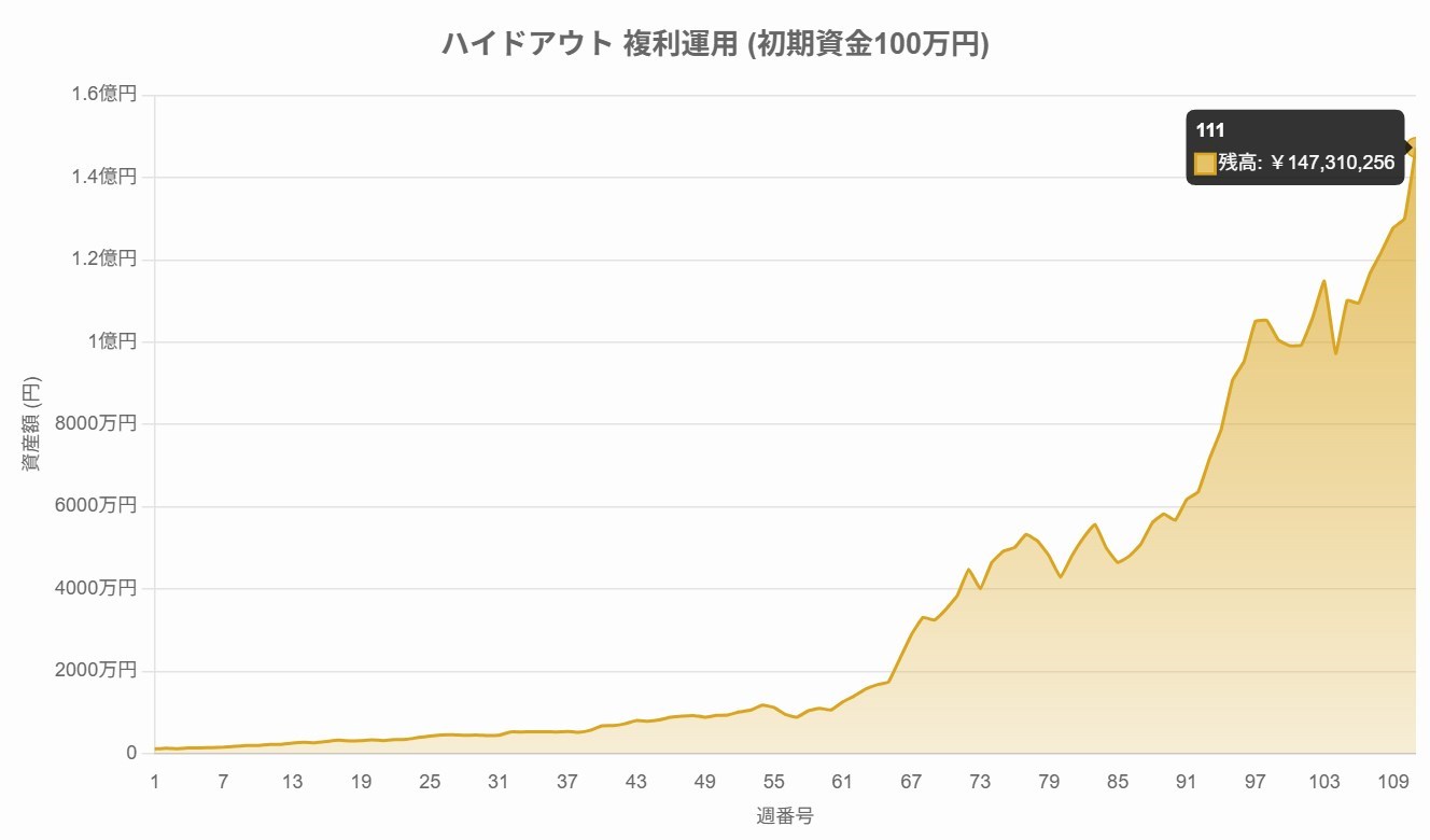 公開トレード履歴において複利運用を実施した場合の資産シミュレーションです