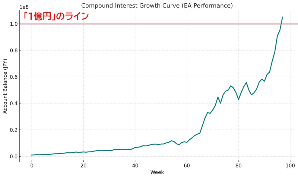 - 回復力: 損失が発生した後も、翌週にはすぐに回復する傾向があります(例えば、第3週の-10%の損失後に第4週で12%のリターン)。このような回復力は、EAが適応性を持ち損失の影響を最小限に抑える能力があることを示しています。