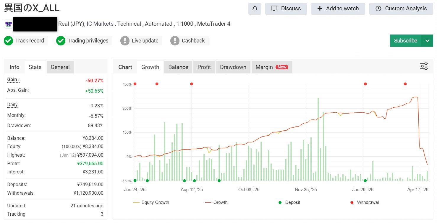 GridFlexは、異国のX1やX3と同じくナンピンを行いますのと特殊なマーチンゲールを使うため余裕のある資金かつ低ロットでの運用をお勧めします。