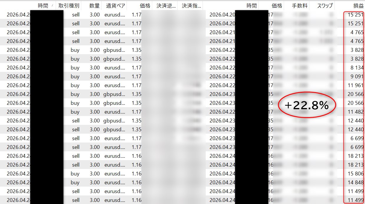 この記事では4月20日週のラストアウトのフォワードテスト結果とトレード事例を紹介しています。