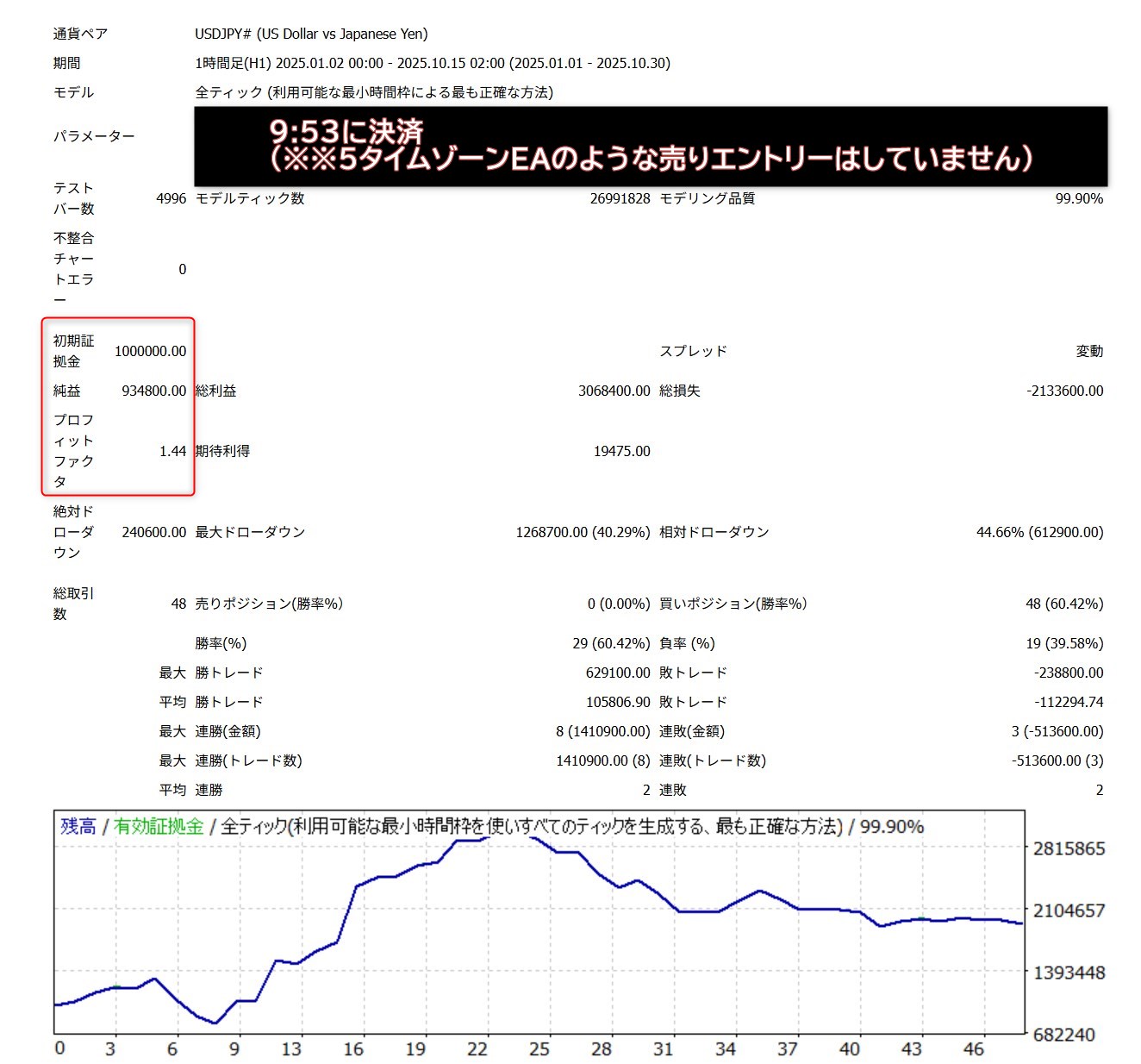 9:53決済版の方は5タイムゾーンEAの特徴である売りエントリーをしていないのでその時点で不利ではあるのですが、仮に9:53版の方で売りエントリーをして同じ程度の利益が出ていたとしても「いつもの5タイムゾーンEA」の方がパフォーマンスが良いです。