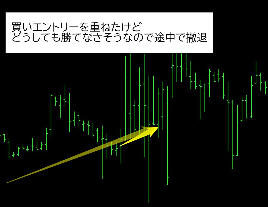 薄い黄色の矢印は画像外のところからポジション保有していて,黄色の矢印で追加エントリーしたのですがどうも勝てなさそうなので途中で損切をしたケースです。