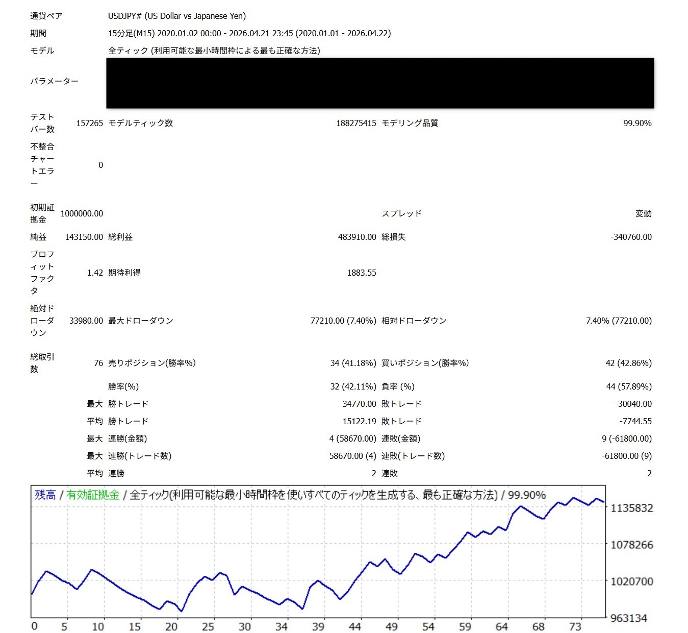 もう少し頻繁にトレードするパラメータもあるのですが、その場合だと2023年と2024年だけ異常に勝てて2025年以降は少し勝てているという感じでした(プロフィットファクターもイマイチ)。ポスト主様がこのEAを使った訳ではありませんが、2023年と2024年は特に勝てていたのかもしれません。
