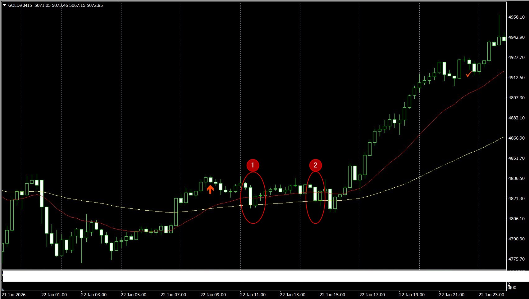上昇トレンドの通貨ペアやCFDに対しては「押し目買い」が有効だと思いますが、今時点でのゴールドではローソク足が移動平均線より上にある状態で、チャート画像の赤い丸で囲ったところがエントリータイミングとして有効です。