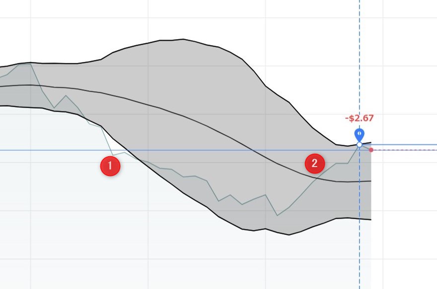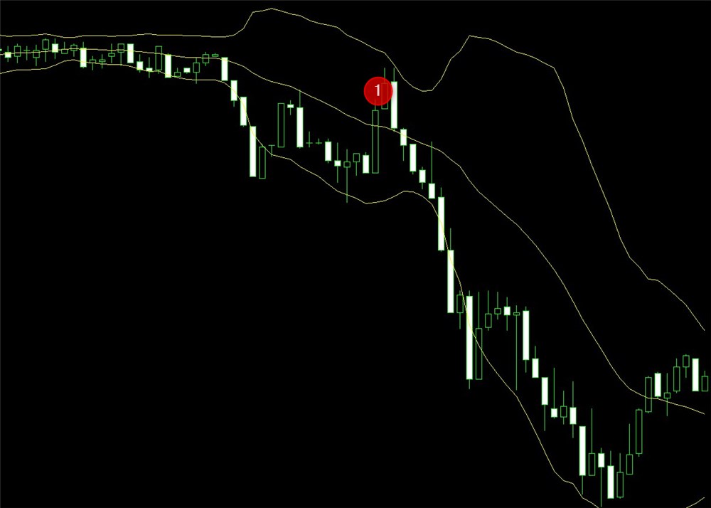 以下のチャート画像は、レートがボリンジャーバンドを割り込んだことを確認(①)、移動平均線ブレイクでエントリー(②)、その後利益確定したトレード事例です。