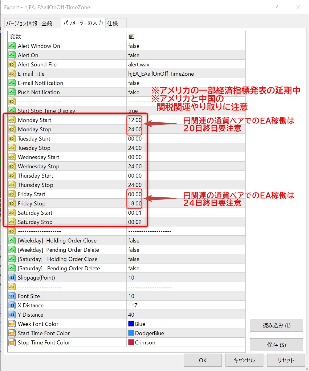 あくまで個人の見解とさせていただくのですが、EA稼働についてはMetaTrader4のEAを自動的にオンオフできる無料EAの設定だと以下のような感じです。