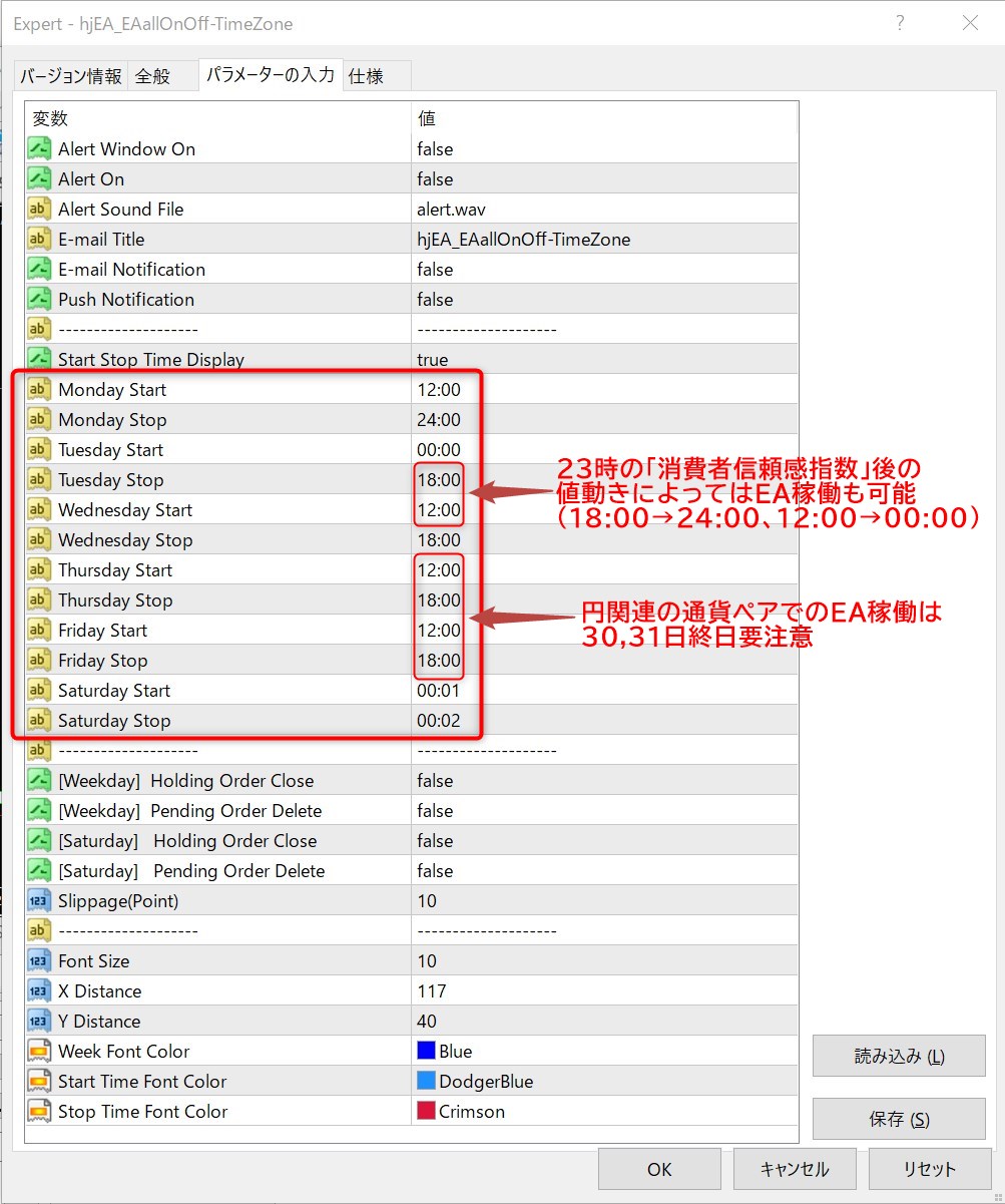 あくまで個人の見解とさせていただくのですが、EA稼働についてはMetaTrader4のEAを自動的にオンオフできる無料EAの設定だと以下のような感じです。