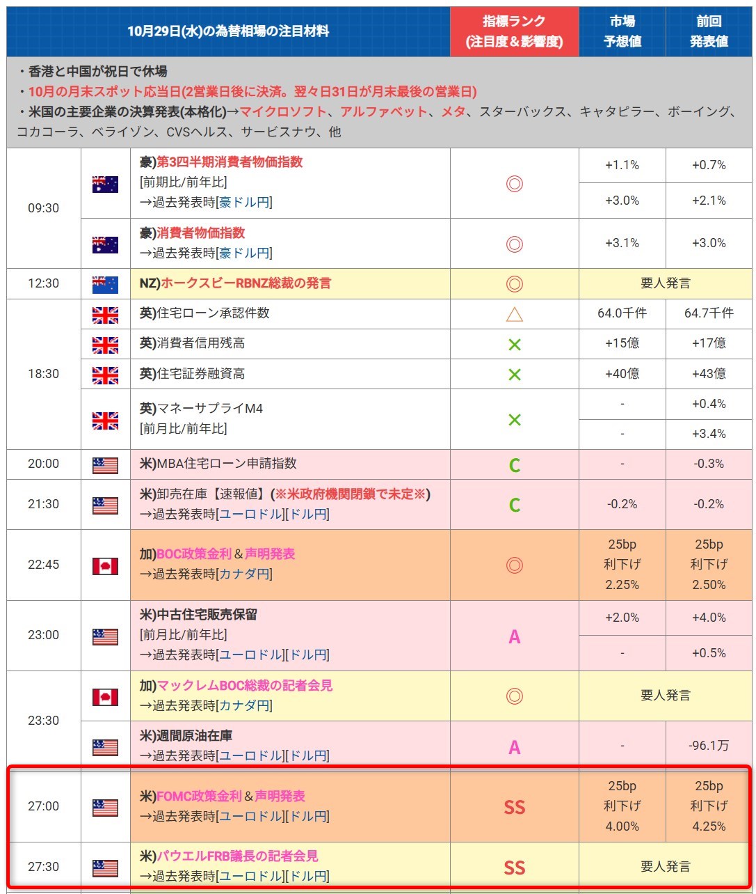 経済指標・要人発言(10/27~10/31)
