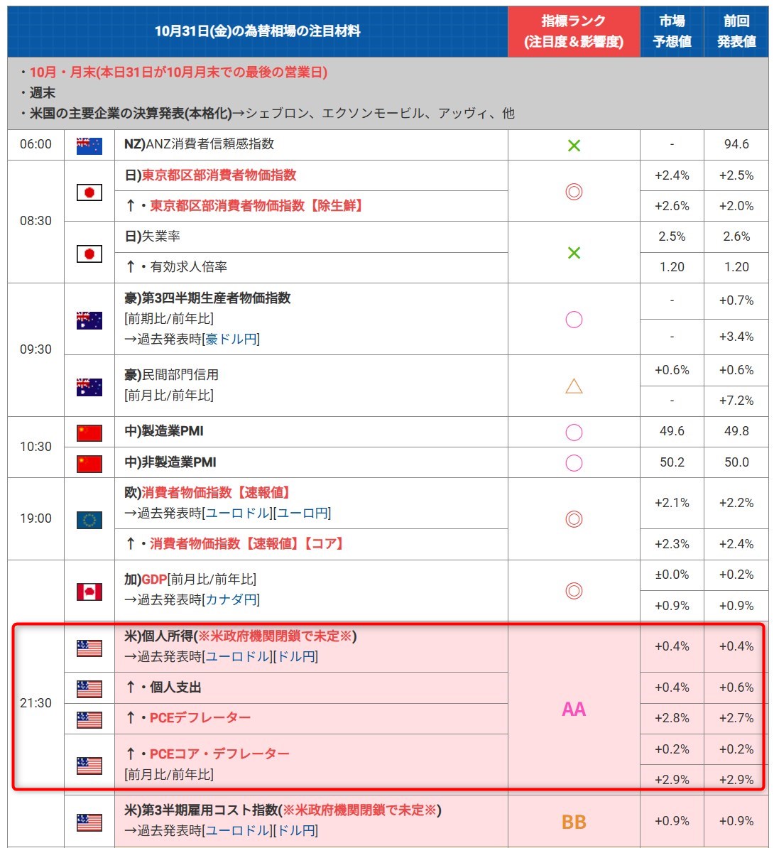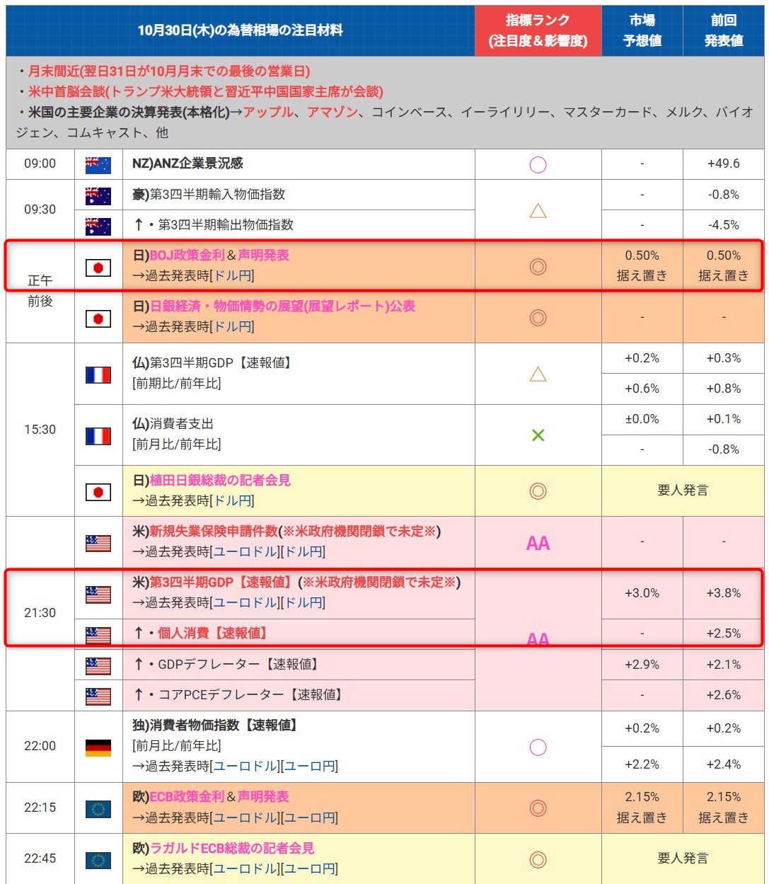 赤い枠で囲った経済指標は特に注意した方が良い経済指標になります。