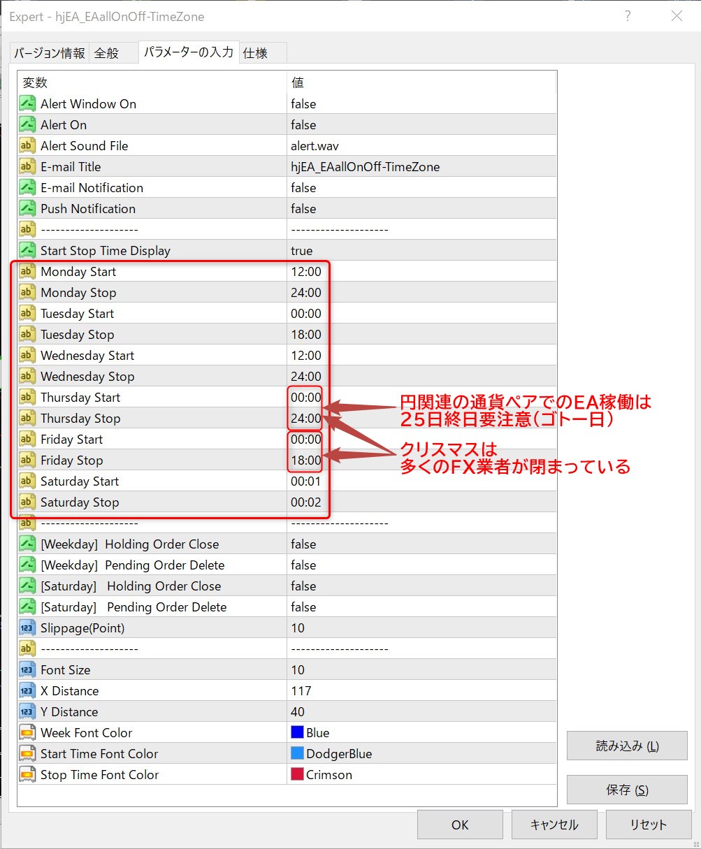 あくまで個人の見解とさせていただくのですが、EA稼働についてはMetaTrader4のEAを自動的にオンオフできる無料EAの設定だと以下のような感じです。