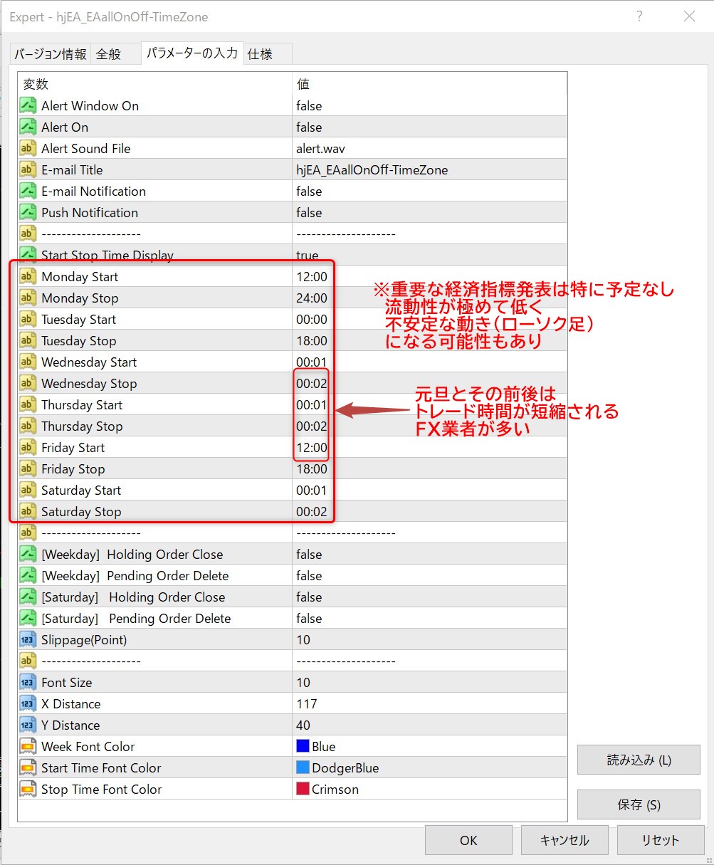 あくまで個人の見解とさせていただくのですが、EA稼働についてはMetaTrader4のEAを自動的にオンオフできる無料EAの設定だと以下のような感じです。