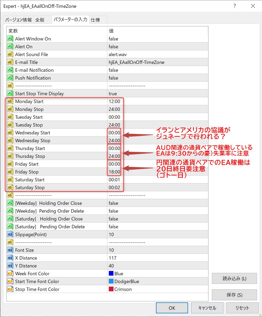 あくまで個人の見解とさせていただくのですが、EA稼働についてはMetaTrader4のEAを自動的にオンオフできる無料EAの設定だと以下のような感じです。