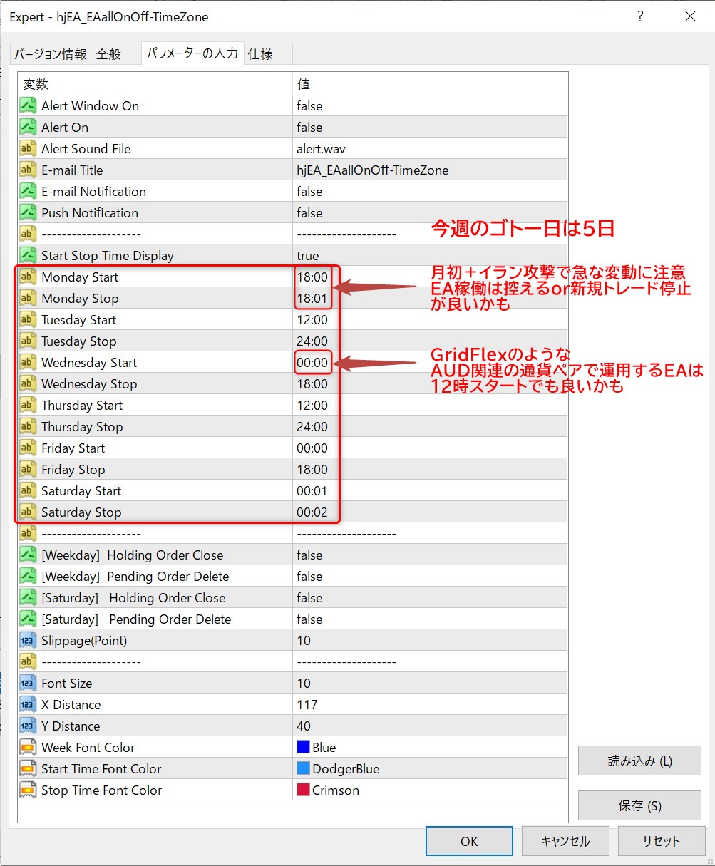 あくまで個人の見解とさせていただくのですが、EA稼働についてはMetaTrader4のEAを自動的にオンオフできる無料EAの設定だと以下のような感じです。