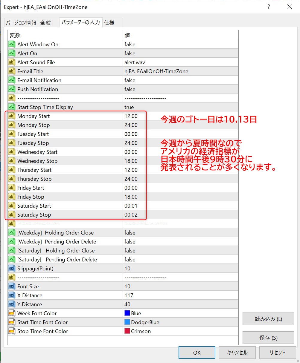 あくまで個人の見解とさせていただくのですが、EA稼働についてはMetaTrader4のEAを自動的にオンオフできる無料EAの設定だと以下のような感じです。