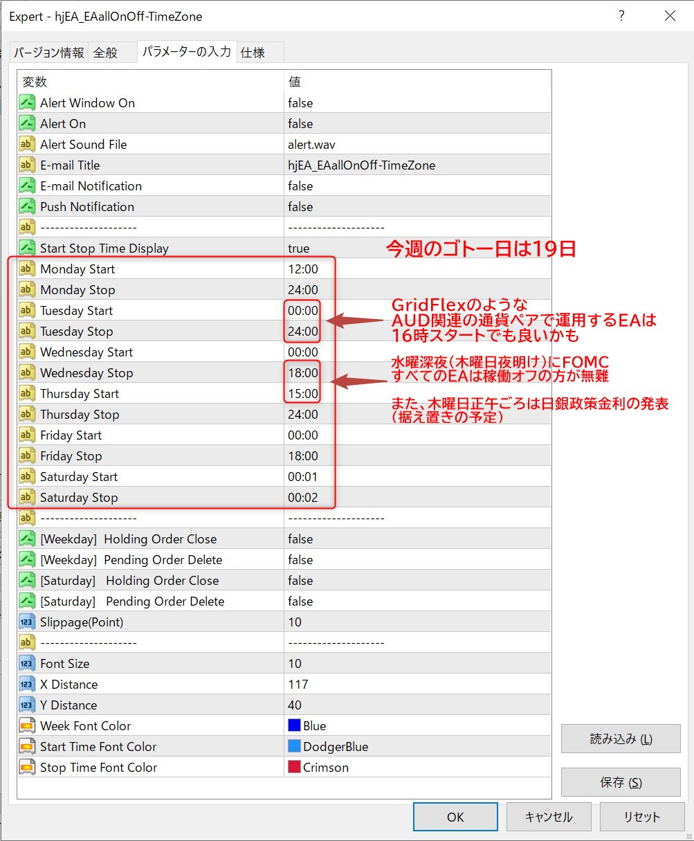 あくまで個人の見解とさせていただくのですが、EA稼働についてはMetaTrader4のEAを自動的にオンオフできる無料EAの設定だと以下のような感じです。