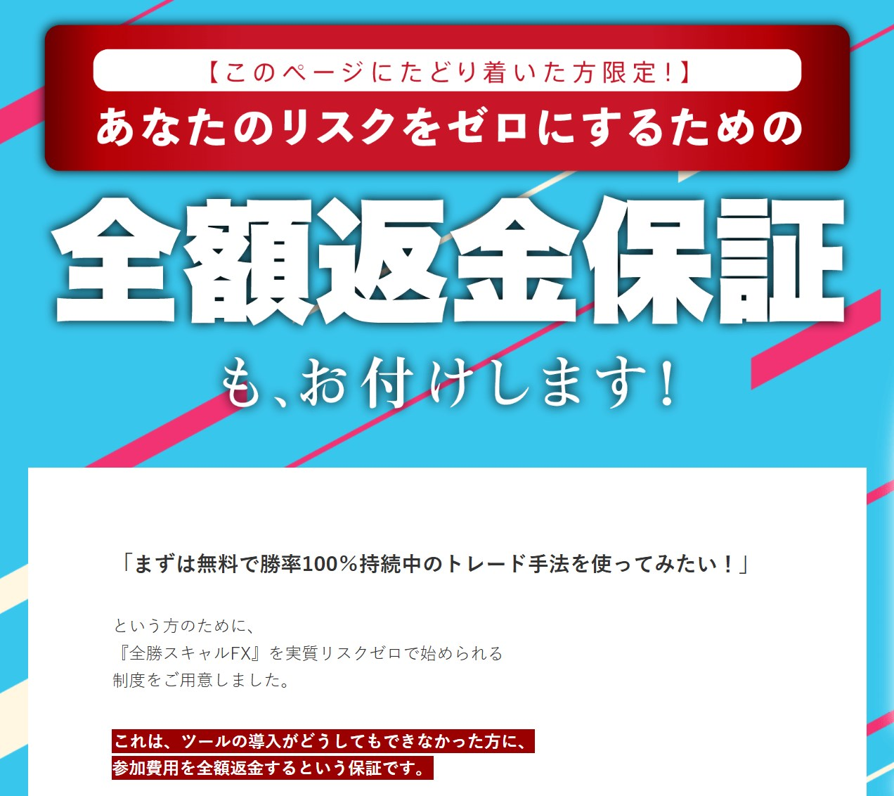 全勝スキャルFXの紹介ページでは「全額返金保証」を大きく謳っています。