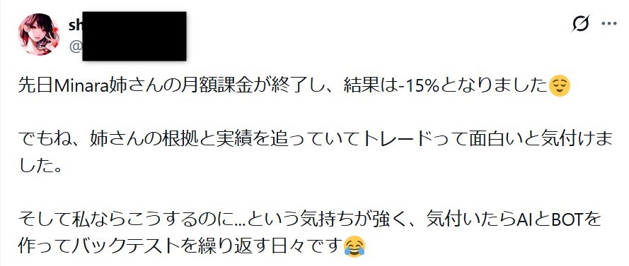 ちなみにAIに自動売買プログラムを書かせてもそれだけじゃ勝てないです。AIに依頼する側の人間がしっかりとしたトレード設計をしておく必要があります(AIはあくまでプログラムを書く補助ツール的な位置づけ)。