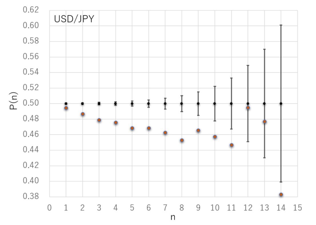 データの特徴としては、n=7までは確率が0.5以下なのでティック単位で7回連続するくらいだと逆方向に進みやすいのですが8回連続になると同じ方向に進みすいという事になります。