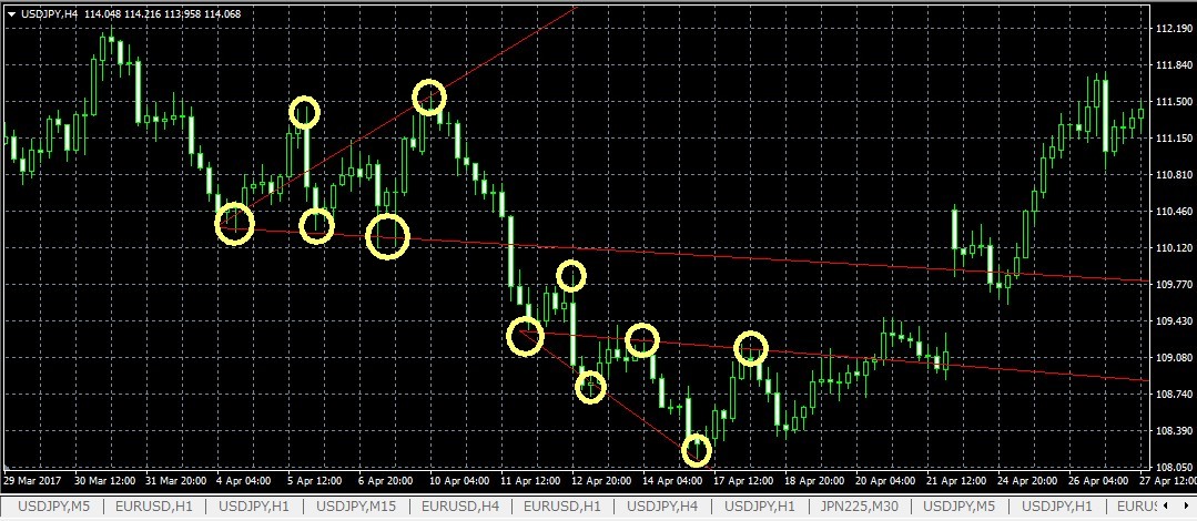 直近の山や谷を5つ見つけてトレンドラインを引くのがコツですね。