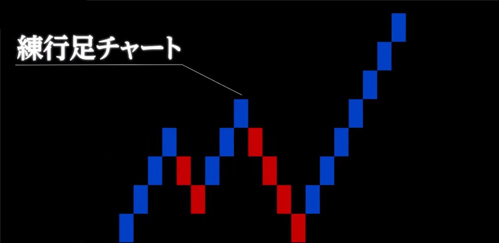 練行足のチャートは、例えば5pips動いたら足が1本できる、というイメージです。